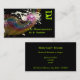 Retro style business card for dj's, musicians and other music related businesses. This exciting musical themed image is a funky retro design of a pastel coloured rainbow with dark multicolored music notes on pieces of sheet music exploding outward. Butterflies and paint splatters seem to burst forth from the centre. The background is an intense show stopping lime green.