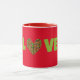 My original artwork on this mug features my created confetti pattern heart acting as the letter 'O' in the word LOVE. The retro appearance of the letters is designed in a complementary bright green colour hue to the heart and gives this one-of-a-kind mug an artsy flair. The inside and handle of this mug is red; however you may change the colour if desired.