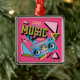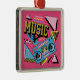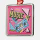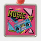 Colourful retro style boombox design with "Music" text decoration, geometric shapes, triangles, rectangles and striped rounded shapes