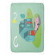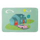 This Retro Suburban House Bath Mat pattern features a typical American home in a typical American neighbourhood, circa 1950. A teal home with a peacock blue roof, and turquoise windows are perfectly offset by a vibrant red front door and garage door. A classic pink, 1950’s finned convertible car is parked on the picturesque driveway. Kitschy, plastic, pink flamingos look right at home on the boomerang shape of freshly mowed green grass resting on a jade background. The manicured lawn is landscaped with whimsical trees. Kidney bean shaped clouds and a yellow sunburst of a sun let you know it’s just another glorious day in mid century modern suburbia.