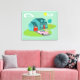 This Retro Suburban House Stretched Canvas Print pattern features a typical American home in a typical American neighbourhood, circa 1950. A teal home with a peacock blue roof, and turquoise windows are perfectly offset by a vibrant red front door and garage door. A classic pink, 1950’s finned convertible car is parked on the picturesque driveway. Kitschy, plastic, pink flamingos look right at home on the boomerang shape of freshly mowed green grass resting on a jade background. The manicured lawn is landscaped with whimsical trees. Kidney bean shaped clouds and a yellow sunburst of a sun let you know it’s just another glorious day in mid century modern suburbia.