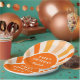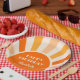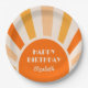 Orange, peach and cream retro sunshine arch frame typography birthday paper plates.