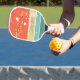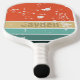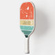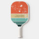 Retro sunset pickleball paddle with an orange, yellow, green, black, and white background. Double-sided and personalised with a name on one side with a cool distressed font.