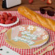 Four Ever Groovy! retro sunshine 4th birthday plates with 70's style daisies and boho fonts and colours.
