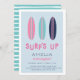 Cute summer birthday party invitations for your little surfer girl's beachside bash feature a trio of vintage surfboard illustrations in navy, pink, and aqua. "Surf's up" appears in retro lettering, with your birthday party details beneath.