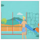 Every day can be a day at the beach with this Retro Surfer Dude Fabric. The 1960's style, minimalist art design features a sun-kissed, blonde, surfer dude all ready to catch a wave. Our fit surfer is gazing out on the ocean through the sliding glass doors of his beachfront home. He is standing in his aqua coloured living room. We can see an aqua and turquoise, stone wall and mid century modern, orange chair. On the opposite side of the glass door, we can see a patio. Beyond that, there is a golden, sandy beach, swaying palm tree, sparkling, peacock blue ocean, and an aqua sky. In the distance, we can see a teal volcanic island, which is dormant for the time being. Surfer Dude is holding a blue surfboard and wearing blue, tiki patterned board shorts. Catch some waves and share some love with this kitschy summer design!