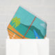 Every day can be a day at the beach with this Retro Surfer Dude Tissue Paper. The 1960's style, minimalist art design features a sun-kissed, blonde, surfer dude all ready to catch a wave. Our fit surfer is gazing out on the ocean through the sliding glass doors of his beachfront home. He is standing in his aqua coloured living room. We can see an aqua and turquoise, stone wall and mid century modern, orange chair. On the opposite side of the glass door, we can see a patio. Beyond that, there is a golden, sandy beach, swaying palm tree, sparkling, peacock blue ocean, and an aqua sky. In the distance, we can see a teal volcanic island, which is dormant for the time being. Surfer Dude is holding a blue surfboard and wearing blue, tiki patterned board shorts. Catch some waves and share some love with this kitschy summer design!