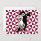 Passionate vintage-style graphic of tango dancers on a bold maroon /burgundy and white geometric background.