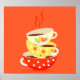 A retro cute, vintage image illustration of three retro style old fashioned tea cups stacked on top of one another against a bright orange on trend background. This whimsical design is for tea and coffee lovers everywhere.