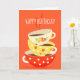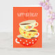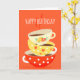 Tea lover's birthday with a retro cute, vintage image illustration of three retro style old fashioned tea cups stacked on top of one another against a bright orange on trend background. This whimsical design is for tea and coffee lovers everywhere. This card has a Happy Birthday greeting