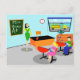 This customisable Retro Teacher Postcard gets an A+! This 1960's style, minimalist art, cartoon drawing features a vibrant, elementary classroom with everything needed to mould the minds of the future. It's the sort of room where ideas are valued and creativity is praised. At the front of the mid century modern classroom, we see the school's most popular teacher standing in front of a chalkboard. Teacher is wearing a bright green and yellow dress, with yellow shoes. Even though the clock on the blue wall tells us it is almost time for the final bell to ring, she still looks as fresh as a daisy. Her black hair is kept in place with a yellow headband and her mod, red glasses help her see to curtail any mischief on the back row. She is resting one hand on her orange and black desk. The clean desk is a tribute to her fine organisational skills. The only thing on the desktop is a shiny, red apple, which was undoubtedly given to her by an adoring student. Speaking of students... We can see a couple of those, as well. From our vantage point, we can see two eager students sitting behind their red, school desks. There is a blonde girl with a bouncy ponytail wearing a bright pink dress. Next to her, there is a dark haired lad wearing a green shirt and blue jeans. Each child is holding a bright blue school book. They are so eager to learn that they haven't even noticed it is almost time for them to board the yellow school bus we see waiting for them through the open blinds on the classroom window. Beneath the window, there is an orange bookshelf holding colourful books and a globe of the world. Don't worry, kids. Tomorrow, you will be back in your places with bright, shining faces. The name on the chalkboard is customisable.