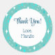 Editable Thank You stickers with script and serif letters on a retro atomic teal and white star pattern on light teal background.