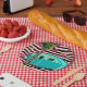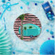 Pink and black striped background with palm tree and turquoise teardrop camper