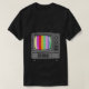 Retro television illustration with rabbit-ear antenna, showing vertical rainbow-coloured bars across the screen. TV set features a boxy design in a muted colour palette with two tuning knobs and a speaker grille. Stylised in a minimalist, flat art aesthetic—perfect for vintage tech art, nostalgic media graphics, or retro pop culture posters. Keywords: vintage TV illustration, retro television icon, colour bar screen, old-fashioned TV design, nostalgic tech drawing, rainbow static display, classic tube TV art.
