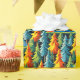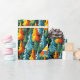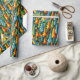 Birthday gift wrap in vintage colours green, tan and orange camping themed gift wrap with tents on a campsite and pine trees.
