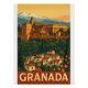 Retro travel poster of Granada, Spain, showcasing the majestic Alhambra Palace on a hilltop with the Sierra Nevada mountains in the background. The palace is bathed in warm golden light of late afternoon, with detailed Moorish arches and towers visible.