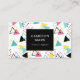 Retro business card featuring a pattern of triangles in different colours: pink, black, turquoise, and yellow. Some triangles are solid, others feature only their outline. Add your name in modern letters on a black label, and your contact info to the back of the geometric business card.