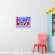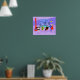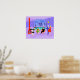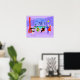 This Retro Tropical Cocktail Party Stretched Poster is intoxicating in its detail. The cartoon design features the type of wildly sophisticated cocktail party that is normally only seen in movies from the 1960s. There is a mid century modern living room filled with partygoers enjoying the swanky, purple decor. A lovely woman in a French maid's uniform is carrying a tray of martinis. She is standing beside a red, cone fireplace with a roaring fire. In the center of the room, an attractive couple is lounging in orange egg chairs. The woman is wearing a bright, green dress. The man is wearing a black suit with a red tie. They are each holding a martini. Another couple is getting cozy beneath a dangling, yellow, Sputnik chandelier. The distinguished, white haired gentleman is wearing a blue suit, light blue shirt and red tie. He is also holding a martini in each hand, showing the world that his partying days are far from over. His companion is a shapely blonde in a stunning red dress. Behind this scene, we can see through floor to ceiling glass walls. The outdoor scene features a round, turquoise swimming pool. We can see the purple silhouette of a woman dipping her legs into the water. Between purple, stone walls, there are silhouettes of palm trees. The silhouettes of dancing and talking partygoers are also visible. If there's one thing this proves, it's that, while people who live in glass houses shouldn't throw stones, they should definitely throw parties!