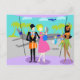 This Retro Tropical Vacation Postcard features a minimalist cartoon drawing of an attractive couple taking the trip of a lifetime! The mid century modern scene is set in a tropical airport. Mr. and Mrs. Tourist are posing in front of the floor to ceiling glass walls. After all, they want to document every moment of their vacation to paradise. Mr. Tourist is dressed in a black suit, light blue shirt, red tie, and black fedora. He is holding an orange suitcase. His arm is around his beautiful bride. She is wearing a hot pink dress. A bright blue handbag is slung over one arm. Not a hair is out of place of her pretty blonde head. It wouldn't do to travel by air and not look your best! Both of them are wearing colourful flower leis around their necks. Beside them, we see a stunning, golden skinned hula girl with flowing black hair. Miss Hula is wearing a traditional grass skirt and an orange bikini top. If that top could talk, it would say, "Hey! I'm a talking top and I match the orange flower in her hair!" On one arm, she has an extra Hawaiian lei ready to offer the next person to step off the plane. Ah, can't you smell the orchids now? On the opposite side of the glass, we can see the luxury, jumbo jetliner that brought the couple to their vacation destination. On the tarmac, 1960's style flight attendant is making her way to the building. She is wearing a form fitting, blue uniform and a blue pillbox hat. Yowza! That gorgeous blonde can offer me coffee, tea, or milk anytime! The sky a shade of aqua that makes you want to reach for the suntan oil! We can see the green silhouettes of palm trees and the dark blue silhouette of a plane flying among the fluffy, light blue clouds. Oh, I hope those poor suckers on that plane aren't on their way back to the daily grind! Aloha!