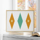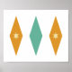 This mid-century modern poster features 3 large diamonds with 2 stars in the center, in a combination of the colors turquoise blue, orange, and cream. This would make a fun addition to your walls!