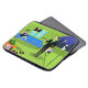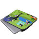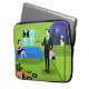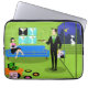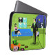 This Retro Urban Cartoon Couple Computer Bag features the cartoon drawing of an elegantly decorated penthouse apartment, overlooking a city skyline. The apartment features a green floor and a green brick wall. On the wall are four Classic Movie Martini Stretched Canvas Prints, also available from StrangeLittleOnion's Zazzle store (hint, hint!). Three of the prints feature turquoise backgrounds and one is on a black background. Beneath the canvas prints, is a blue, mid century modern sofa. A sophisticated, raven-haired beauty is sitting on the sofa. She is wearing a classic, little, black dress with a hot pink bodice. On the opposite side of the room there is a suave, tall, dark, and handsome man. He is wearing a black suit, white shirt, and green tie. In one hand, he is holding a vinyl record album, and, in the other hand, he is holding a fun album cover. On the floor, there is an orange ottoman holding a green and black record player. Propped against the ottoman is another album cover with a record rolling out of the side. There are also three colourful vinyl albums scattered about the floor. Behind the man, we can see through the sliding glass doors onto a green balcony. A white cat wearing a pink collar is perched on the edge of the balcony. Beyond the cat, there is a breathtaking city skyline complete with skyscrapers and a yellow crescent moon. If this is how the other half lives, sign me up!