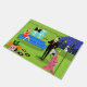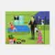 This Retro Urban Christmas Couple Door Mat features the cartoon drawing of an elegant penthouse apartment all decorated for the holidays with strands of colourful Christmas lights and a kitschy, pink, Christmas tree, complete with teal ornaments and a yellow star. The apartment features a green floor and a green brick wall. On the wall are four Classic Movie Martini Stretched Canvas Prints, also available from StrangeLittleOnion's Zazzle store (hint, hint!). Three of the prints feature turquoise backgrounds and one is on a black background. Beneath the canvas prints, is a blue, mid century modern sofa. A sophisticated, raven-haired beauty is sitting on the sofa. She is wearing a vibrant, red dress and Santa hat. In one hand, she is holding a sprig of mistletoe tied with a red bow. On the opposite side of the room there is a suave, tall, dark, and handsome man. He is wearing a black suit, white shirt, and red tie. In one hand, he is holding a vinyl record album, and, in the other hand, he is holding a fun album cover. On the floor, there is an orange ottoman holding a green and black record player. Propped against the ottoman is another album cover with a record rolling out of the side. There are also three colourful vinyl albums scattered about the floor. Behind the man, we can see, through sliding glass doors, snow falling onto a green balcony and the city below. A white cat wearing a red bow around its neck is perched on the edge of the balcony. Beyond the cat, there is a breathtaking city skyline complete with skyscrapers and a yellow crescent moon. If this is how the other half lives, sign me up!