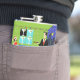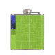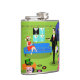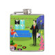 This Retro Urban Christmas Couple Flask features the cartoon drawing of an elegant penthouse apartment all decorated for the holidays with strands of colourful Christmas lights and a kitschy, pink, Christmas tree, complete with teal ornaments and a yellow star. The apartment features a green floor and a green brick wall. On the wall are four Classic Movie Martini Stretched Canvas Prints, also available from StrangeLittleOnion's Zazzle store (hint, hint!). Three of the prints feature turquoise backgrounds and one is on a black background. Beneath the canvas prints, is a blue, mid century modern sofa. A sophisticated, raven-haired beauty is sitting on the sofa. She is wearing a vibrant, red dress and Santa hat. In one hand, she is holding a sprig of mistletoe tied with a red bow. On the opposite side of the room there is a suave, tall, dark, and handsome man. He is wearing a black suit, white shirt, and red tie. In one hand, he is holding a vinyl record album, and, in the other hand, he is holding a fun album cover. On the floor, there is an orange ottoman holding a green and black record player. Propped against the ottoman is another album cover with a record rolling out of the side. There are also three colourful vinyl albums scattered about the floor. Behind the man, we can see, through sliding glass doors, snow falling onto a green balcony and the city below. A white cat wearing a red bow around its neck is perched on the edge of the balcony. Beyond the cat, there is a breathtaking city skyline complete with skyscrapers and a yellow crescent moon. If this is how the other half lives, sign me up!