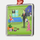 This Retro Urban Christmas Couple Ornament features the cartoon drawing of an elegant penthouse apartment all decorated for the holidays with strands of colourful Christmas lights and a kitschy, pink, Christmas tree, complete with teal ornaments and a yellow star. The apartment features a green floor and a green brick wall. On the wall are four Classic Movie Martini Stretched Canvas Prints, also available from StrangeLittleOnion's Zazzle store (hint, hint!). Three of the prints feature turquoise backgrounds and one is on a black background. Beneath the canvas prints, is a blue, mid century modern sofa. A sophisticated, raven-haired beauty is sitting on the sofa. She is wearing a vibrant, red dress and Santa hat. In one hand, she is holding a sprig of mistletoe tied with a red bow. On the opposite side of the room there is a suave, tall, dark, and handsome man. He is wearing a black suit, white shirt, and red tie. In one hand, he is holding a vinyl record album, and, in the other hand, he is holding a fun album cover. On the floor, there is an orange ottoman holding a green and black record player. Propped against the ottoman is another album cover with a record rolling out of the side. There are also three colourful vinyl albums scattered about the floor. Behind the man, we can see, through sliding glass doors, snow falling onto a green balcony and the city below. A white cat wearing a red bow around its neck is perched on the edge of the balcony. Beyond the cat, there is a breathtaking city skyline complete with skyscrapers and a yellow crescent moon. If this is how the other half lives, sign me up!