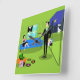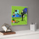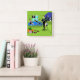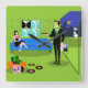 This Retro Urban Cartoon Couple Wall Clock features the cartoon drawing of an elegantly decorated penthouse apartment, overlooking a city skyline. The apartment features a green floor and a green brick wall. On the wall are four Classic Movie Martini Stretched Canvas Prints, also available from StrangeLittleOnion's Zazzle store (hint, hint!). Three of the prints feature turquoise backgrounds and one is on a black background. Beneath the canvas prints, is a blue, mid century modern sofa. A sophisticated, raven-haired beauty is sitting on the sofa. She is wearing a classic, little, black dress with a hot pink bodice. On the opposite side of the room there is a suave, tall, dark, and handsome man. He is wearing a black suit, white shirt, and green tie. In one hand, he is holding a vinyl record album, and, in the other hand, he is holding a fun album cover. On the floor, there is an orange ottoman holding a green and black record player. Propped against the ottoman is another album cover with a record rolling out of the side. There are also three colourful vinyl albums scattered about the floor. Behind the man, we can see through the sliding glass doors onto a green balcony. A white cat wearing a pink collar is perched on the edge of the balcony. Beyond the cat, there is a breathtaking city skyline complete with skyscrapers and a yellow crescent moon. If this is how the other half lives, sign me up!