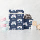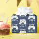 Designed to match our Level Up birthday party invitations and accessories, this retro gamer themed wrapping paper set features a pattern of game controllers on a navy blue background with "[Name] has reached level [age]" in vintage digital style lettering.