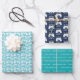 Designed to match our Level Up birthday party invitations and accessories, this retro gamer themed wrapping paper set features three patterns: a turquoise blue background with a pattern of vintage video game controllers and handheld consoles, a game controller on a navy blue background with "[Name] has reached level [age]", and a repeating pattern of "happy birthday [name]" in retro computer lettering on a teal background.