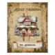 Beautiful retro vintage illustration of a family walking towards their new Christmas decorated house on a retro grunge background and frame for an aged or vintage look. Design features a vintage scroll ribbon for your personalisation of this elegant and festive holiday wall art decor.