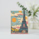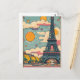 A vibrant and colourful illustration of the Eiffel Tower in Paris, France, with a retro, vintage aesthetic. The image features a bright blue sky with fluffy clouds, a large sun, and twinkling stars. The Eiffel Tower is prominently displayed in the centre, surrounded by charming Parisian buildings and trees.