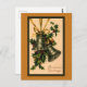 This Christmas postcard has a vintage image of two silver bells tied together with a gold ribbon. Green holly with red berries are the accent. Bottom left has text that says "Christmas Greetings".