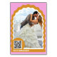 Our minimal, bold retro style wedding table number is perfect for the trendy couple who loves standing out and making a bold statement. Our design features a bold bright pink and yellow colour combo. A simple abstract wavy arch shape creates a bold look with the table number displayed boldly in white large font. Customise with a fun fact about the couple on each of the table numbers. The reverse side features a full photo layout with a customisable QR code to link guests to a website etc