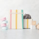 A seamless pattern featuring gentle wavy stripes in a vintage-inspired colour palette of red, yellow, teal, and pink on a cream background. The softly flowing lines create a playful, rhythmic design that evokes a sense of nostalgia. This pattern’s warm, retro colours add a whimsical and cheerful vibe.