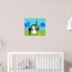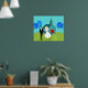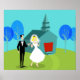 This Retro Wedding Couple Poster will have you hearing wedding bells. The 1960's style, minimalist art design features a bride and groom on their wedding day. The happy couple looks good enough to be standing atop a wedding cake. But they aren't. They're standing on lush, green grass. The debonaire Mr. is wearing a classic, black tuxedo with black bow tie. Down, ladies! He's taken! He is holding the hand of his beautiful Mrs., who looks positively radiant in her tea length, white gown with form fitting waist and flared skirt. She truly looks like a princess with her tiara and gauzy, white wedding veil resting on her pretty blonde head. Beside them, a path in the grass leads to the world's most charming chapel. The quaint, teal and turquoise church is the perfect setting for saying, "I do!" Yes, here is the church. Here is the steeple. We can only assume that, behind those bright red, double doors is a roomful of people just waiting to share in this couple's happiness. The picturesque setting also includes four, stylistic, cartoon trees in shades of blue. It's a beautiful day for a wedding, as we can see from the flawless aqua sky. The only thing missing from this mid century modern design is the rice, and we can assume that will be forthcoming. This design bridal shops, wedding planners, and for congratulating your favorite newlyweds.