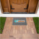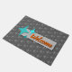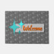 Orange welcome with retro aqua stars on a grey star pattern background.