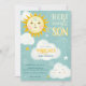 Introducing our retro whimsical "Here Comes the Son" illustrated baby shower invitation, a charming retro design perfect for celebrating the arrival of a baby boy. This delightful invitation features a whimsical, hand-drawn sun with a smiling face, surrounded by fluffy clouds and twinkling stars on a soft blue background. The playful text in vintage-style fonts adds a nostalgic touch, making this invitation both fun and heartwarming. With its sunny theme and adorable illustrations, it's sure to set the tone for a joyful and memorable baby shower.