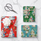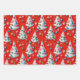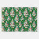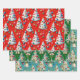 This set of wrapping paper features a whimsical and retro Christmas theme. The designs showcase a repeating pattern of fluffy white Christmas trees decorated with colourful vintage ornaments and beaded garlands. One design is set against a vibrant red background, while another is on a classic green background. The third option, with a light blue background, includes hanging bells and snow details. This charming paper is perfect for anyone who loves the nostalgic feel of a mid-century holiday.