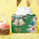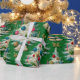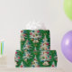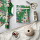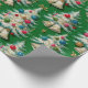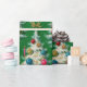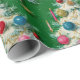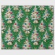 This wrapping paper features a whimsical and retro Christmas theme. This design showcases a repeating pattern of fluffy white Christmas trees decorated with colourful vintage ornaments and beaded garlands. This design is set against a vibrant green background. This charming paper is perfect for anyone who loves the nostalgic feel of a mid-century holiday.