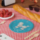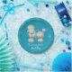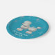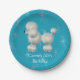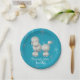 Whimsical retro style paper plates, with graphics of pink and white star bursts on an aqua blue background. Graphics of a white fuzzy looking poodle decorates the middle, of the plate. Personalise the white text for your special event, matching paper napkins available.