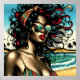 Pretty retro African American woman in bikini sitting on beach with sunglasses on in vintage colours in a pop art comic style.
