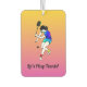 Cool retro women's tennis player design on a handy car air freshener! Great small gift for teammates and coaches, or as a stocking stuffer for anyone who loves racquet sports. Lovely pink and yellow background gradient with your custom text at the bottom.