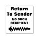 This rubber stamp design features the messages "Return To Sender" and "NO SUCH RECIPIENT", along with a decorative arrow symbol. It could be used to indicate that received postal mail has been delivered to the wrong address, and should be returned to the sender.