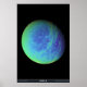 Bright, wispy markings stretch across a region of darker terrain on Saturn's moon Rhea. In this extreme false-colour view, the roughly north-south fractures occur within strips of material (which appear greenish here) that are a different colour from the surrounding cratered landscape. The origin of the colour differences is not yet understood, but it may be caused by subtle differences in the surface composition or grain sizes making up the icy soil. Wispy markings were seen on the trailing hemispheres of both Rhea and Dione in images taken by NASA's Voyager spacecraft, and were hypothesized by some researchers to be the result of material extruded onto the surface by ice volcanism. Cassini's earlier revelation of the braided fractures on Dione led to speculation that Rhea's wisps might also be created by fractures.