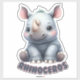 The word "RHINOCEROS" is displayed in bold, bubbly letters at the bottom of the design, styled in a soft grey colour with a pink outline that complements the rhino’s natural tones. The playful font enhances the cheerful and child-friendly vibe of the sticker. A clean white border surrounds the entire design, ensuring it pops vividly against any background, whether applied to walls, furniture, or other nursery décor items.