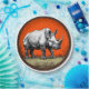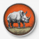 Stylised depiction of a rhinoceros presented in a circular format. The rhino is displayed in a dynamic pose, showcasing its prominent horn and robust body. The background is a vivid orange colour, which contrasts with the black edges of the circle, creating a striking visual effect. The ground beneath the rhino is illustrated with subtle details, resembling a textured landscape. Surrounding the rhino are thorny bushes or stylised vegetation. The overall style combines realism with artistic flair, producing an eye-catching and impactful composition.