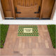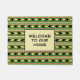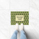 Black and yellow rhinos march across green stripes alternating with loosely “woven” stripes in African colours of red, black and green with yellow accents on this easy to customise welcome mat.