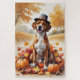 A watercolor-style painting of a cheerful dog sitting amidst a pile of vibrant fall leaves, surrounded by tiny pumpkins and scattered acorns. The dog wears a little pilgrim hat and beams with joy, capturing the spirit of Thanksgiving. In the background, soft harvest fields and golden-hued trees create a peaceful countryside ambiance. Gentle textures and warm, muted autumn tones give the scene a cosy, nostalgic feel perfect for celebrating the beauty of the season.